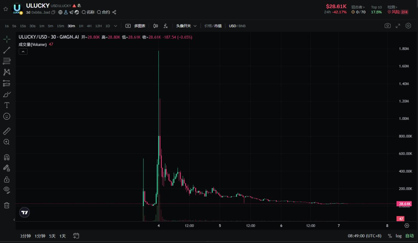 BSC 上的仿盘 ULUCKY,于当日 16 点左右发布,立即上涨至市值 50 万美元仅仅约 15 分钟后又接近完全归零,这时我与同事南枳均相继割肉离场,且并未参与到之后在约当日 23 时开始的第二波涨势,其市值一度冲至 180 万美元,没有在这中间进行抄底可谓是“拍断大腿”。