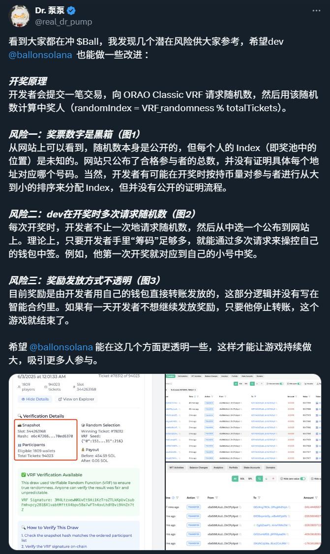 有社区用户(@real_dr_pump)提出了多条迟疑,指出其抽奖原理并不完全公开透明,也并不如官方所言完全自动化发放: