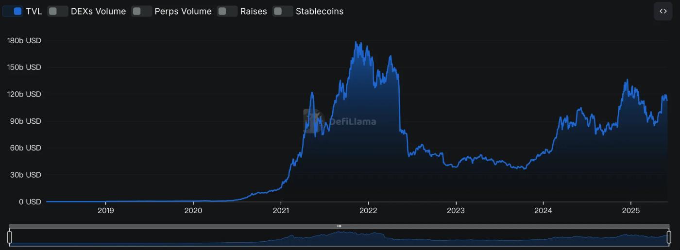 回顾 2020 到 2021 年间,DeFi 以让人目瞪口呆的速度迅速崛起。当时,整个市场的锁仓量(TVL)从十几亿美元一路飙升,最高峰时竟达到 1780 亿美元。像 Uniswap、Aave 这些听起来怪怪名字的协议,一时间成了全球加密界的网红项目。