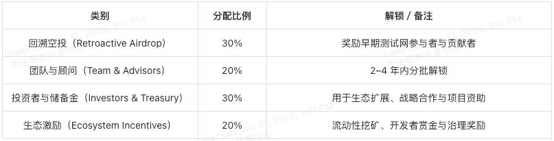 – 团队与顾问(≈ 20% ):份额将在两至四年内按期解锁,确保核心成员持续投入。