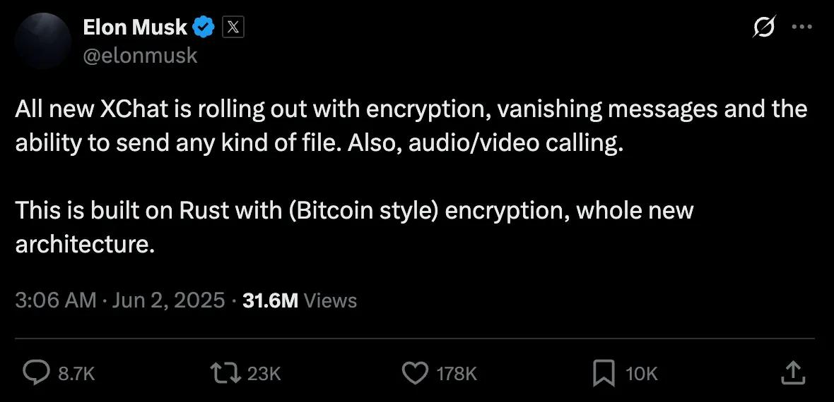 最近采用率有所上升的Signal是一个潜在的候选者。然而,一个更强大的竞争者可能是X即将推出的通讯服务XChat。鉴于X与加密社区的深度融合,XChat可以利用其现有用户群实现强势的市场进入。
