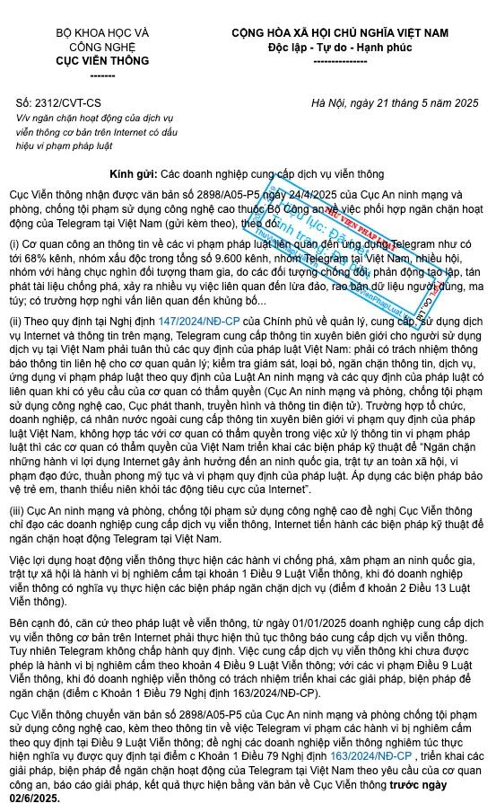 2025年5月21日,越南信息通信部应公安部要求,发布了第2312/CVT-CS号命令,指示所有电信运营商在6月2日前在国内屏蔽Telegram服务。
