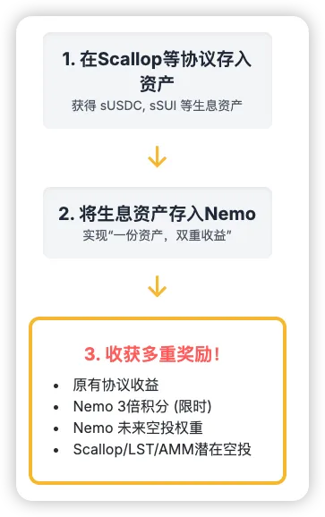 如果你本来就在 Scallop 等平台挖矿,现在只需将产生的生息资产(如 sUSDC, sSUI)再存入 Nemo,就能在不影响原有收益的基础上,额外叠加 Nemo 的高额积分奖励和未来空投预期。