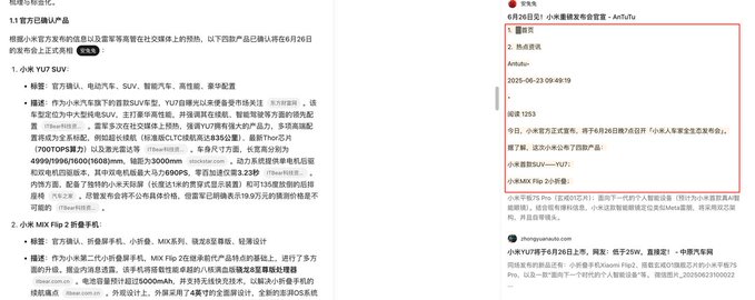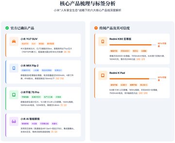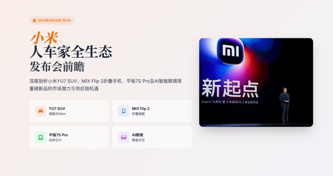 提示词:整理并搜索小米 2025 年 6 月 26 日发布会内容,为不同产品打标签,并为每条传闻打出 可信度百分比,把即将发布的产品预估规格与竞品对比,输出雷达图或热力表,结合往年同期销量、宏观消费指数、渠道备货传闻,给出保守 / 基准 / 激进三种销量区间,并解释关键假设,列出最可能受益的 10 家 A-股或港股供应链公司(附业务关联理由、过去 30 日股价表现),并按高-中-低敏感度分级。