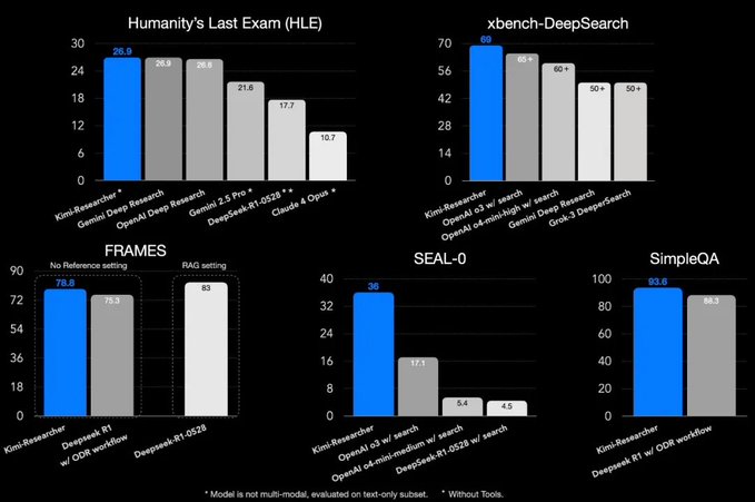 在HLE (Humanity’s Last Exam) 和红杉的 Agent 测试上 kimi 深度研究模型都取得了不错的成绩。