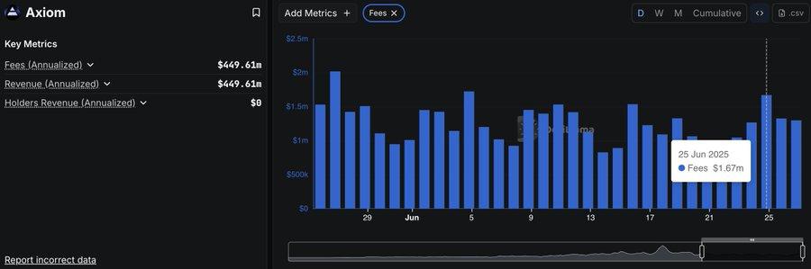 虽然 1% 的现货手续费听起来较高,目前尚未广泛采用,但随着更多长尾资产在 Hyperliquid 上线,这一费率可能会成为常态。例如,在 Solana 上专注 Meme 币交易的 Axiom,每日因收取 1% 接口费用而创收超过 100 万美元。尽管这些收入大多来自 Solana,但随着 Hyperliquid 上的现货部署者逐步增加,这类收入有望转移到 Hyperliquid 上。