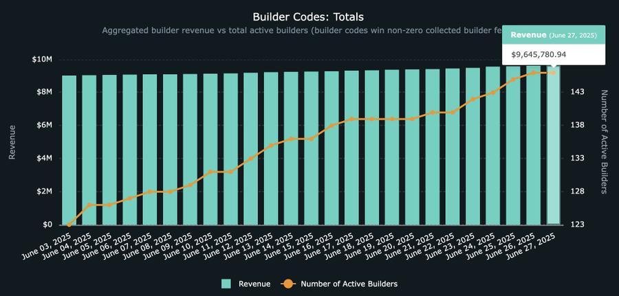 随着 Hyperliquid 建设者代码(Builder Code)收入接近 1000 万美元,我们有必要对这一新兴生态系统及其背后的应用进行一次深入解析,并探讨其对 Hyperliquid 在基础设施层面未来走向的深远意义。一个协议能够同时在应用层和基础设施层占据主导地位并不常见,而 Hyperliquid 正在朝着这一方向稳步前行,其 Builder Code 背后的理念也日益清晰。