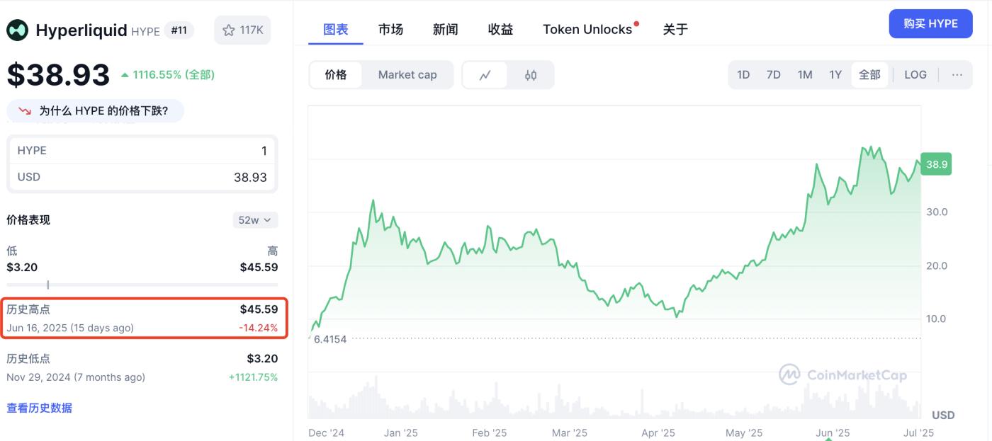 但随着时间进入 4 月,特朗普发起关税贸易战后又放出缓颊利好,大盘市场连同合约市场给了 Hyperliquid 新一轮的发展机遇,HYPE 也开启了自己的底部修复乃至再创新高之旅—— 5 月 23 日,HYPE 价格突破 33 美元,超越 2024 年 12 月 22 日的 32.3 美元,创下历史新高;直至 6 月 16 日,HYPE 价格创下 45.59 美元的历史最高。
