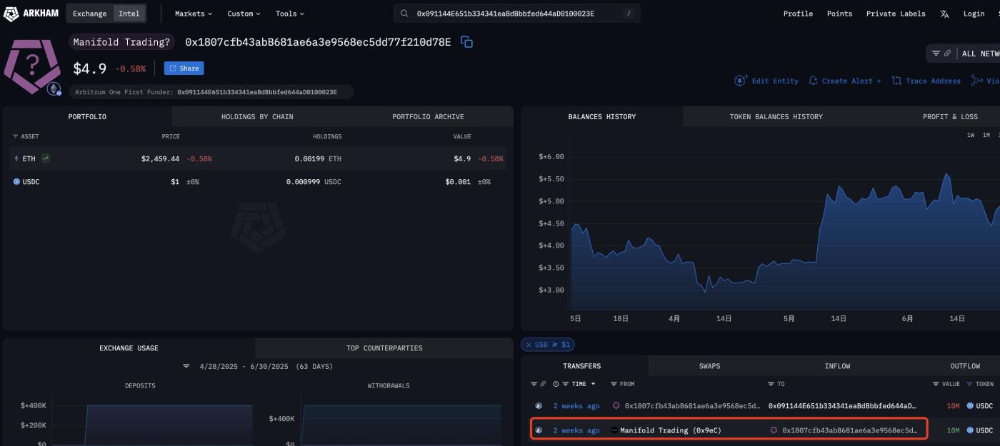 据笔者从 Arkham 平台查找的信息,地址 0x091144E651b334341eaBdBbbfed644aD0100023E 确实是 ManifoldTrading 关联地址,此前该地址曾于 6 月 16 日从地址 0x1807cfb43abB681ae6a3e9568ec5dd77f210d78E 收到 ManifoldTrading 转入的 1000 万美元资金。疑似 galaxy 地址 0xcaC19662Ec88d23Fa1c81aC0e8570B0cf2FF26b3 情况类似。