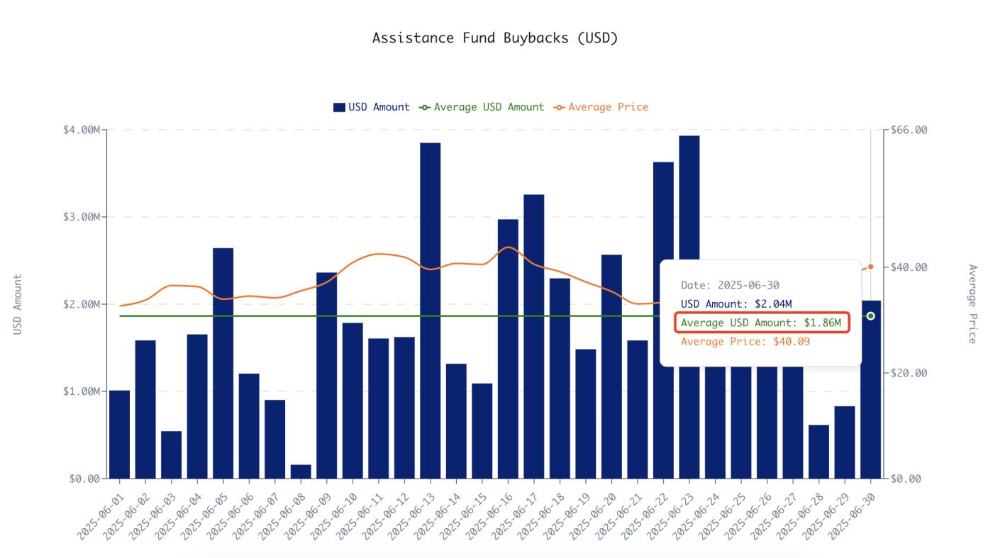 据 ASXN Data 网站数据,根据截至 2025 年 6 月 30 日的过去 30 天链上数据,Hyperliquid 协议的 HYPE 代币日均回购额为 186 万美元。可以说,这一回购资金是总量 10 亿枚、流通量约为 3.3 亿枚的 HYPE 代币最大的上涨动力。