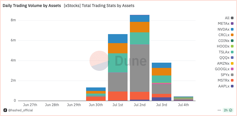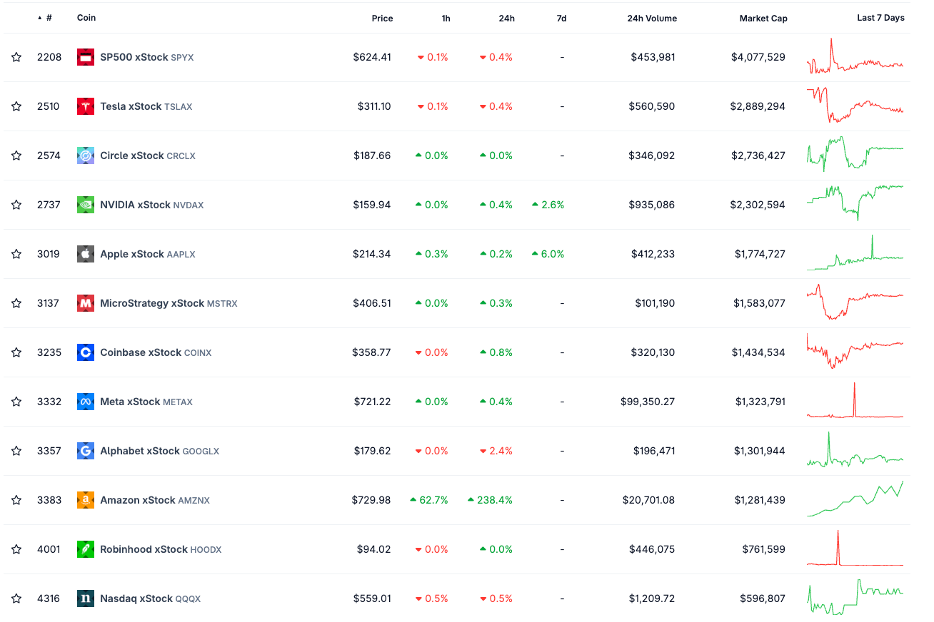 Backed Finance 的 xStocks 和 Robinhood 是股票代币化领域的两大领跑者。我们先从 xStocks 开始。这些是 1:1 支持的 ERC-20/SPL 代币,可以映射 AAPLx、TSLAx 和 MSTRx 等真实股票。目前, Solana和Bybit、Gate 和Kraken等中心化交易所已上线 50 多种代币化股票。