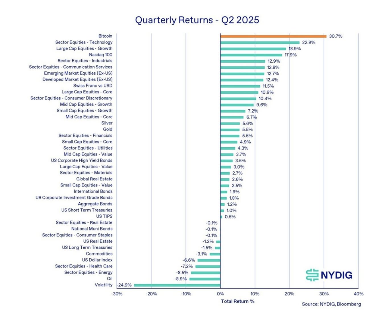 比特币一举击败了它,并在 2025 年第二季度的季度回报率中领先。这是比特币的世界,我们就生活在其中。