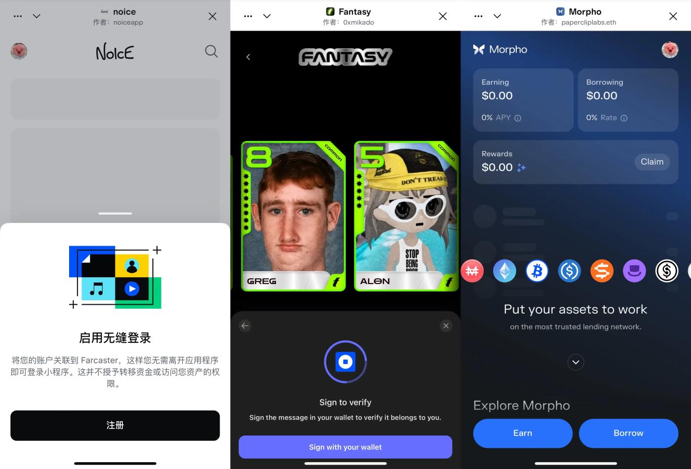 应用则是加密生态内的热门项目,例如 Noice、Fantasy、Morpho 等,用户可以直接打开 Mini App 操作。