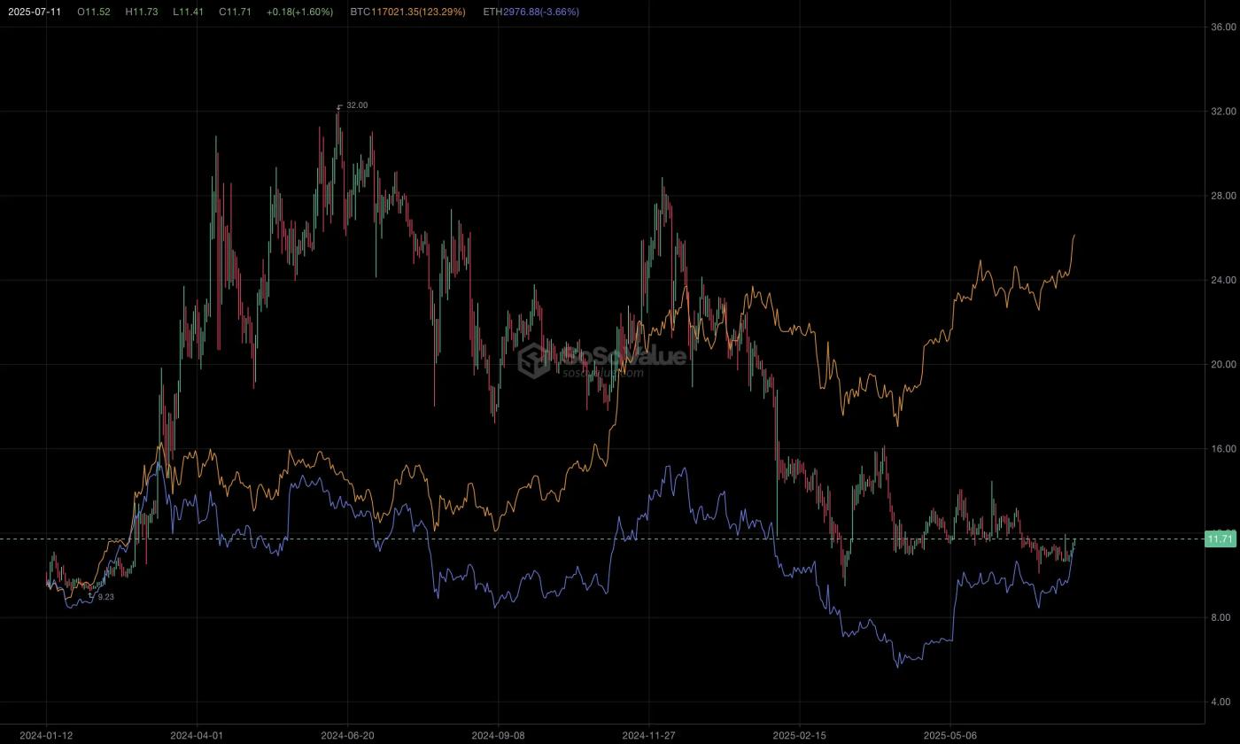 社交赛道的涨跌与大盘周期并不相符呈现独立行情,源:SoSoValue(黄:BTC、蓝:ETH、红绿:社交赛道指标)