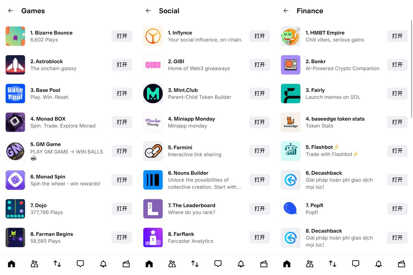 从单一的加密资产管理工具,跃迁为一个融合社交关系、交易执行、内容分发与线下消费的「链上超级入口」。其对 Farcaster 的深度集成,使钱包不仅能承载资产与 DApp,还内嵌了社交时间流、短视频、聊天、信息推送等模块,重构了用户的交互方式与停留动线。与此同时,钱包中嵌入的 MiniApp 与应用推荐系统,则让其承担起了 Base 生态项目发现与冷启动的功能,同时使 Coinbase 对旗下「支付 、社交 、交易 、消费」的生态项目闭环。