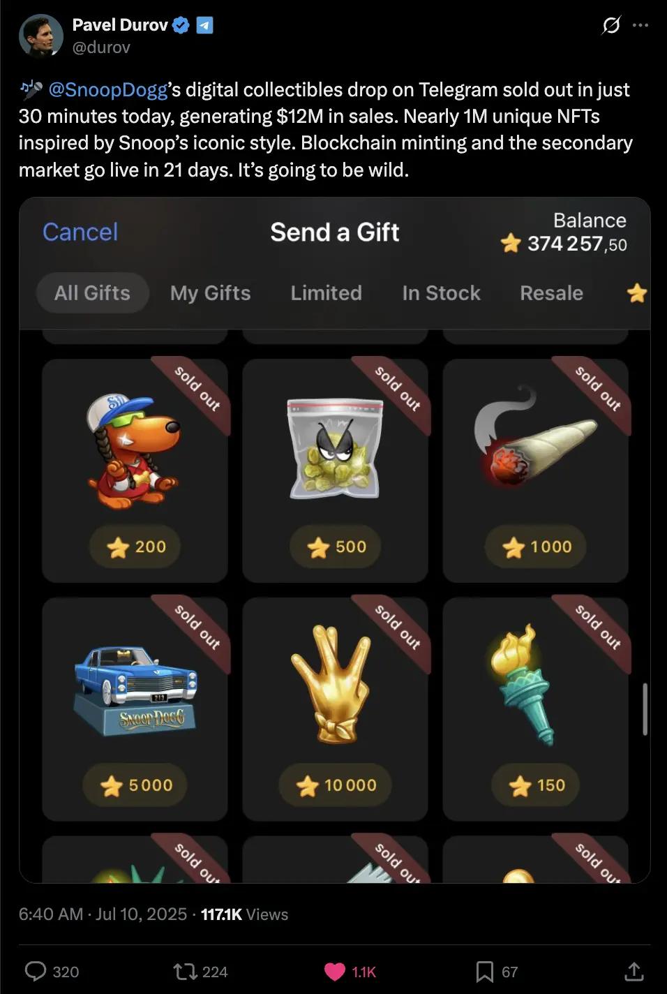 P.S. 就在本访谈直播后 24 小时,Snoop Dogg 发布了《Gifts》音乐视频,并推出 Telegram 礼物系列 —— 近 100 万份独特 NFT 在 30 分钟内售罄,销售额超过 1,200 万美元。