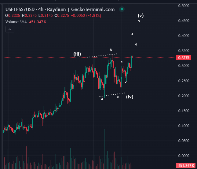 looks like that 5th wave higher on $useless still in play and the w4 likely looking like a running flat here, next stop probably takes a stab at 400m mcap x.com/Bluntz_Capital…