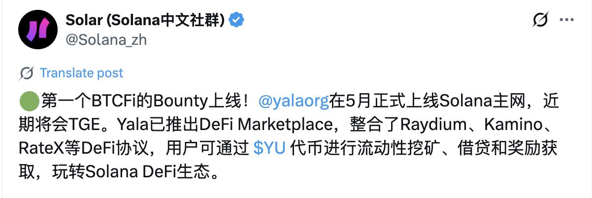 比特币原生流动性协议 Yala 昨晚宣布了其 Season 1 空投细则,将于 TGE 当天开放空投申领。在 5 月上线 Solana 主网后,Solana 中文社区透露 Yala 近期就将 TGE。Yala 背景如何,协议原理是什么,Season 1 如何分配,后续该如何参与?