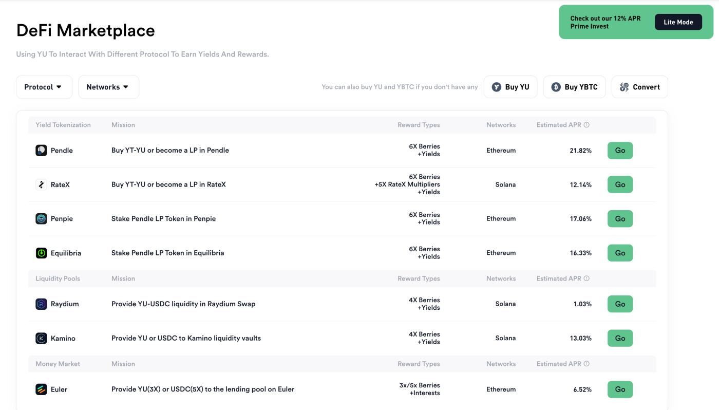 此外,Yala 平台引入 AI 收益代理(Yay-Agent),通过整合 DeFi 协议和 RWA 产品,实现 7 天 24 小时自动收益,为用户提供稳定的年化回报(例如 Lite Mode 固收 12%)。Yala 的 DeFi 市场(DeFi Marketplace)允许用户在同一界面跨链访问 Solana 上的 Raydium、Kamino 等流动性协议,用 YU 赚取交易费和复利奖励,并通过 Berries 积分来获得额外激励。