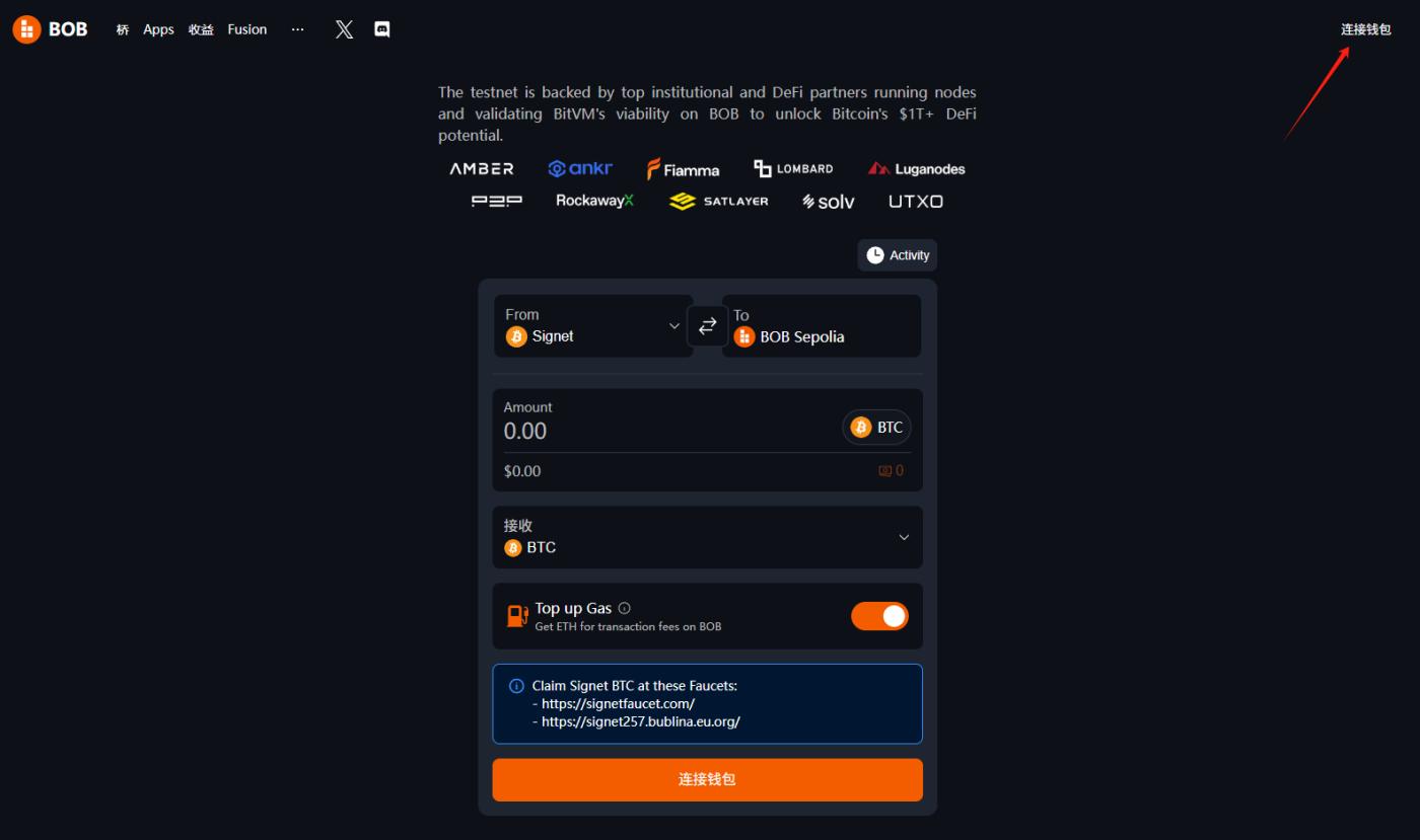 STEP 1. 进入交互网站后,点击连接钱包,分别连接 EVM 钱包与 BTC 钱包。