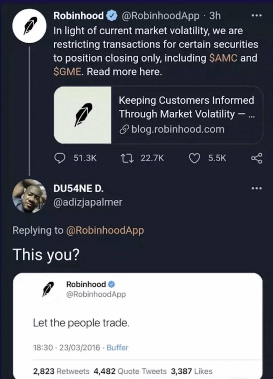 数百万散户投资者认为 Robinhood 背叛了“金融民主化”的承诺,批评其向华尔街势力低头,甚至有阴谋论指控 Robinhood 与 Citadel Securities(其最大订单流合作方)暗中勾结,操纵市场以保护对冲基金利益。