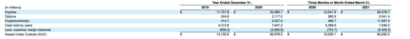 尤其是 2020 年,伴随着新冠疫情、美国政府的刺激政策和全民投资热,平台用户和交易量双双飙升,托管资产一度突破 1350 亿美元。
