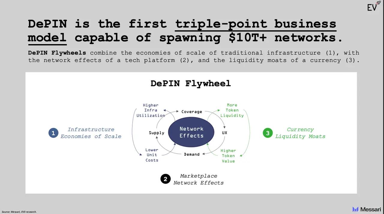 根据 Messari 的 DePIN Flywheel 模型,DePIN 作为一种新型基础设施范式,不只是简单地让“设备上链”,而是依赖三种相互强化的动力机制,构成一个可以推动万亿美元级网络增长的“结构飞轮”。