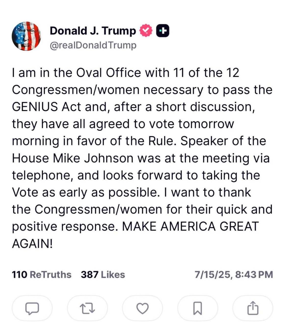 美国时间 7 月 15 日晚间,特朗普在 Truth Social 平台发文称将与 11 名反对的共和党议员会面,称他们已同意在 7 月 16 日上午(美国时间)再次投票支持规则条款,美国众议院议长约翰逊称希望周三在众议院再次尝试就加密货币法案进行程序性投票。