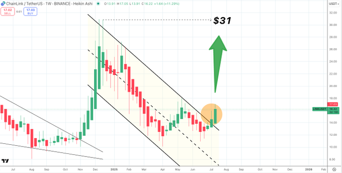 $LINK finally exiting descending channel consolidation and trying to break out ... $31 I see you 😍