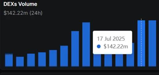 根据DeFiLlama数据显示,接入币安Alpha后,波场TRON生态数据就显现了增长态势:7月11日币安Alpha专区上线当天,波场TRON链上DEX交易量就出现了显著跃升,单日交易量从前一日的6400万美元突破了1亿美元,增幅超50%。7月17日晚间,波场TRON专属Alpha交易大赛启动后,当日链上DEX交易量更冲至1.42亿美元,创近半月内新高。