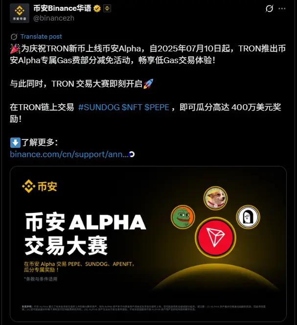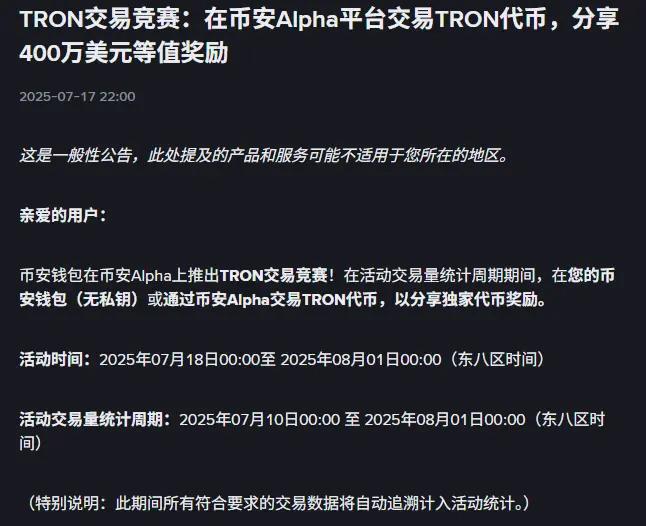 币安Alpha启动波场TRON生态专属百万美元交易大赛