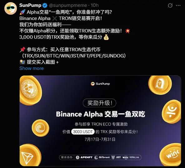 「Boost Sprint」二期交易竞赛活动“Alpha交易一鱼两吃”在币安Alpha 交易大赛启动当日同步上线了,旨在为参与波场TRON生态代币交易的用户加码福利。用户只要买入任意已上线币安CEX和币安Alpha的波场TRON生态代币,不但可以积累Alpha交易积分,还可参与瓜分价值3000USDT的TRX代币额外奖励,实现一份交易双重收益,即Alpha交易“一鱼多吃”。活动时间为7月17日-7月31日。