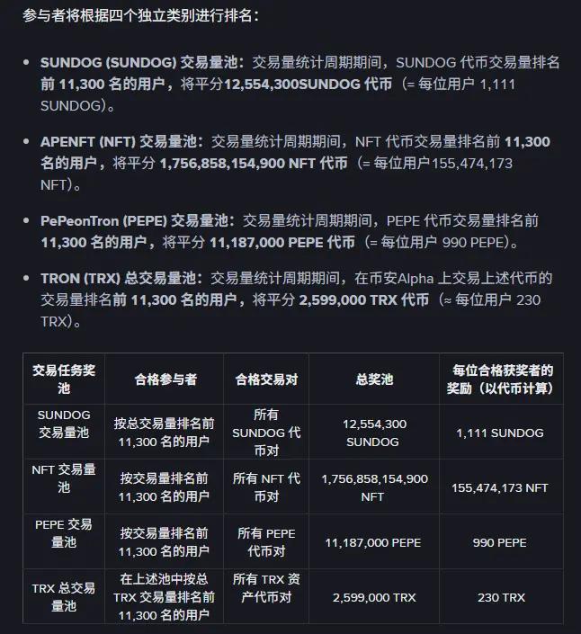 - Alpha专区:NFT(APENFT交易平台)、PePe(SunPump Meme币)、PePe(SunPump Meme币)