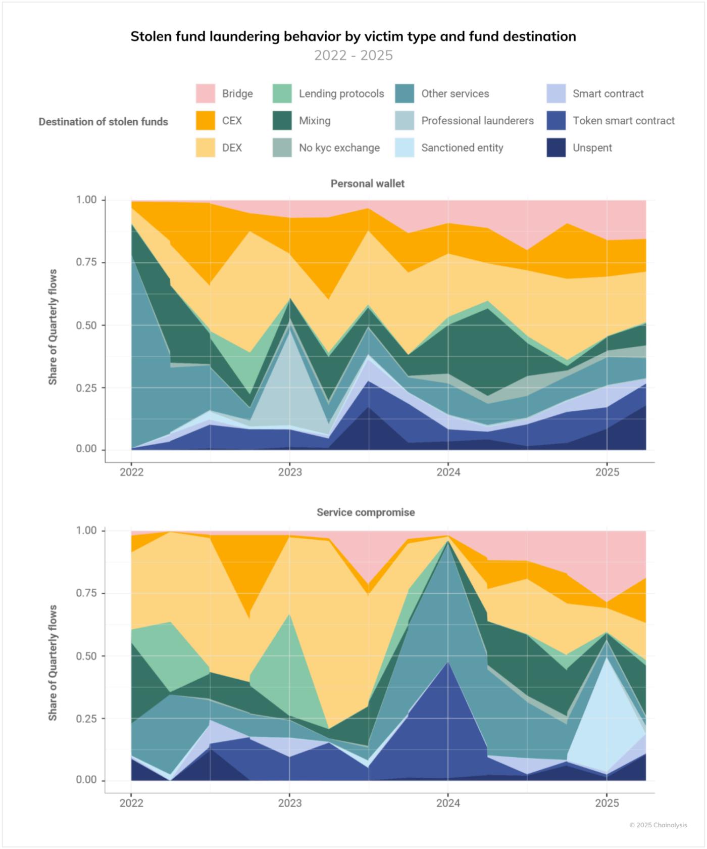 具体而言,在2024年和2025年,针对服务的网络攻击者将积极使用桥接和跳链作为洗钱手段。此外,针对服务的攻击者使用加密货币混合器的情况比针对个人钱包的攻击者更为普遍。