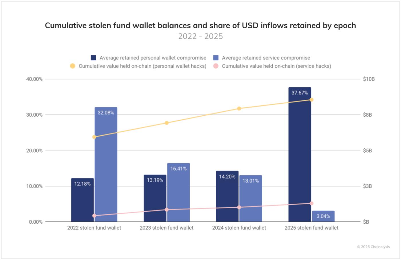 - 入侵个人钱包的网络攻击者越来越不愿意立即清洗被盗资产,导致大量被盗资金滞留在链上。目前,从个人钱包中窃取的加密资产中,有 85 亿美元被滞留在链上,而从服务中窃取的加密资产中,有 12.8 亿美元被滞留在链上。