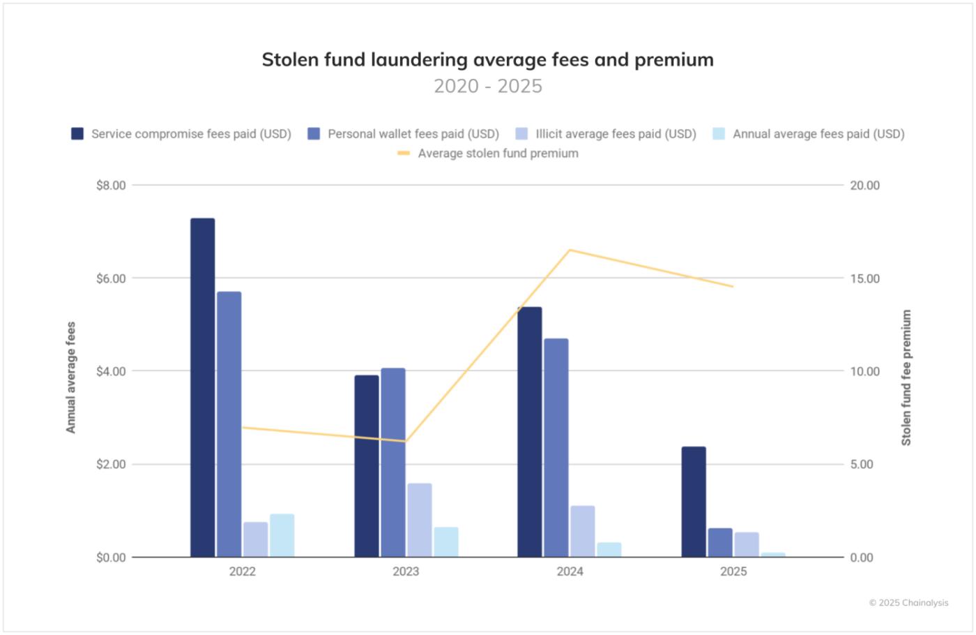 - 洗钱者为转移被盗资金付出了高昂的成本,平均溢价从 2021 年的 2.58 倍增加到 2025 年迄今的 14.5 倍。