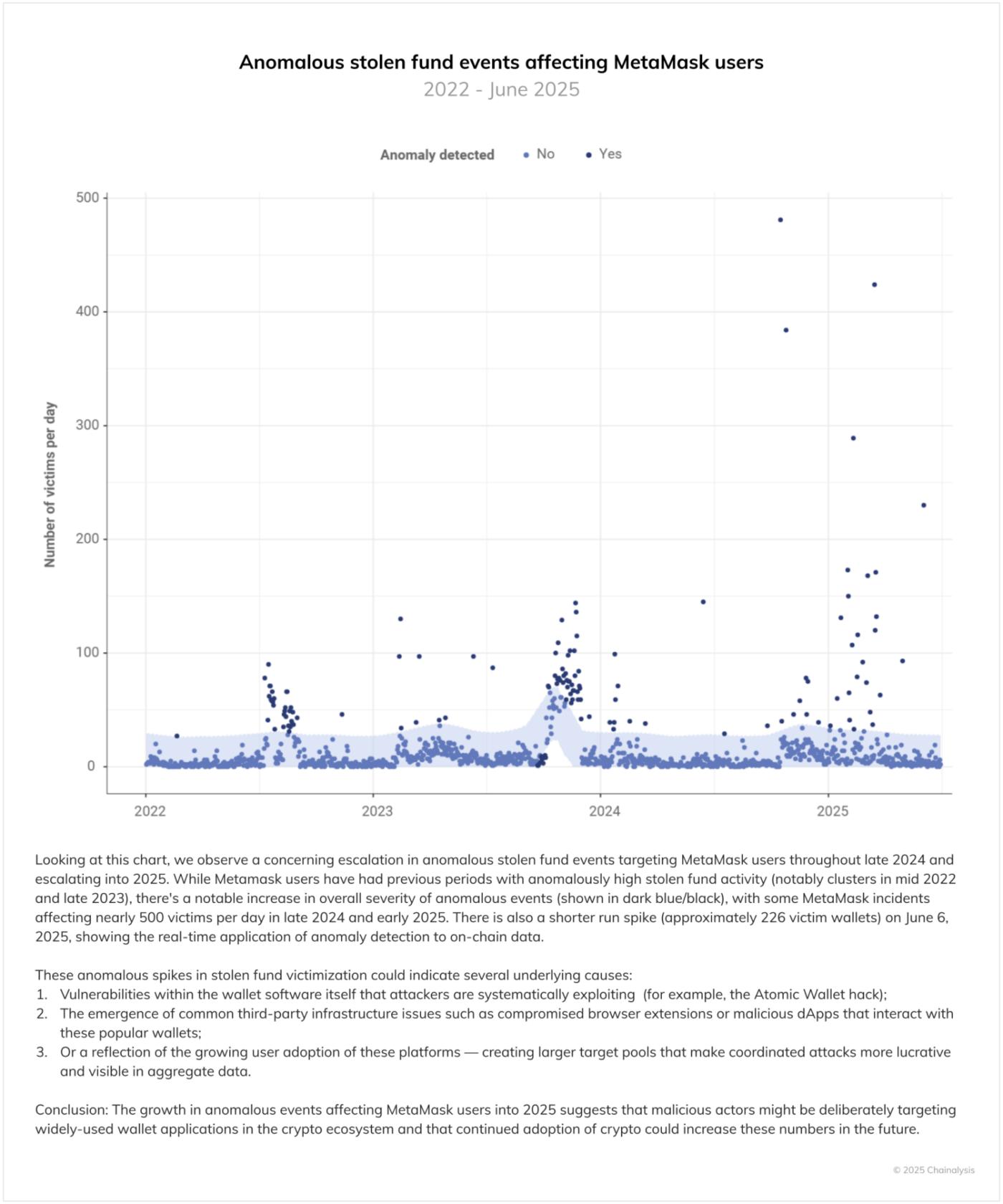 该图表显示,从 2024 年末到 2025 年,针对 MetaMask 用户的异常资金盗窃事件数量令人担忧地增加。虽然 MetaMask 用户此前也经历过资金被盗率异常高的时期(尤其是在 2022 年中期和 2023 年末的集群事件),但异常事件的整体严重程度(以深蓝色/黑色显示)已显著增加,2024 年末和 2025 年初的 MetaMask 事件每天导致近 500 名受害者。2025 年 6 月 6 日还出现了一次短暂的峰值(约 226 个钱包受害),这表明异常检测技术正在实时应用于链上数据。
