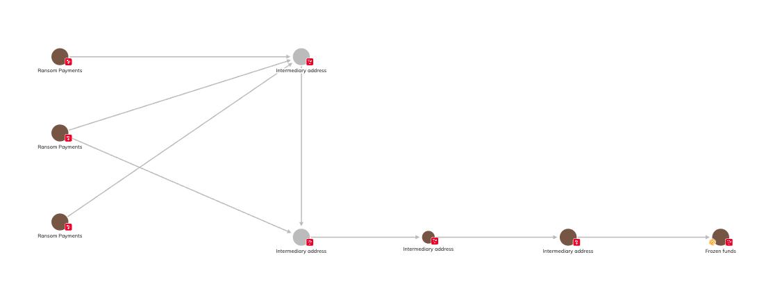 我们的全球服务团队利用Chainalysis Reactor与 PNP 调查人员合作追踪赎金踪迹。区块链分析显示,多笔赎金通过一系列中间地址进行转移,然后通过其他中间地址进行洗钱。在 PNP 的协助下,Chainalysis 联系了 Tether,并与该公司合作成功冻结了部分 USDT 资金。