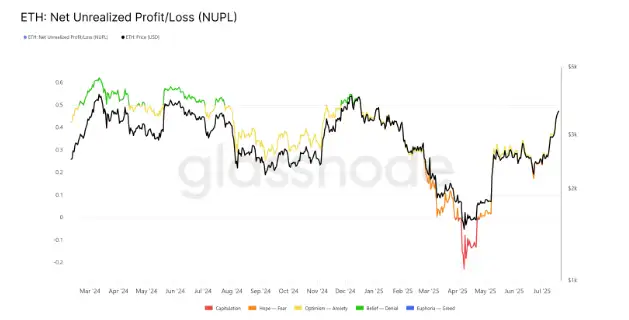以太坊的网络价值与交易量(NUPL)比率正逼近“信念-否定”区域。历史数据显示,当NUPL进入该区域,以太坊价格往往出现短期调整。该指标本质上是市场情绪的“过热检测器”,当盈利投资者比例过高时,容易触发获利回吐潮。