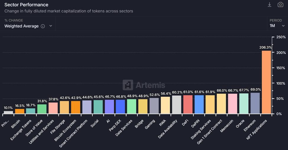 传统NFT项目正在大量购买和推高。根据Artemis的数据,NFT板块已经跑赢大盘,在过去一个月里上涨了200%以上。值得注意的是,NFT板块的表现已经超过以太坊市场三倍多。