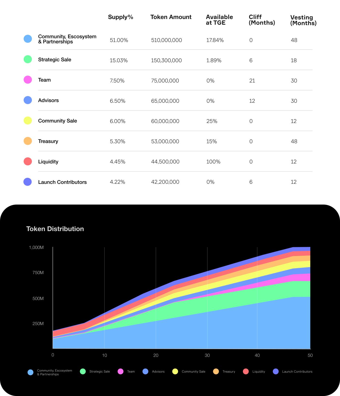 社区、生态系统与合作伙伴:占比 51%,为 5.1 亿枚,TGE 时解锁 17.84%,剩余部分将在 TGE 后的 24 月进行线性解锁;