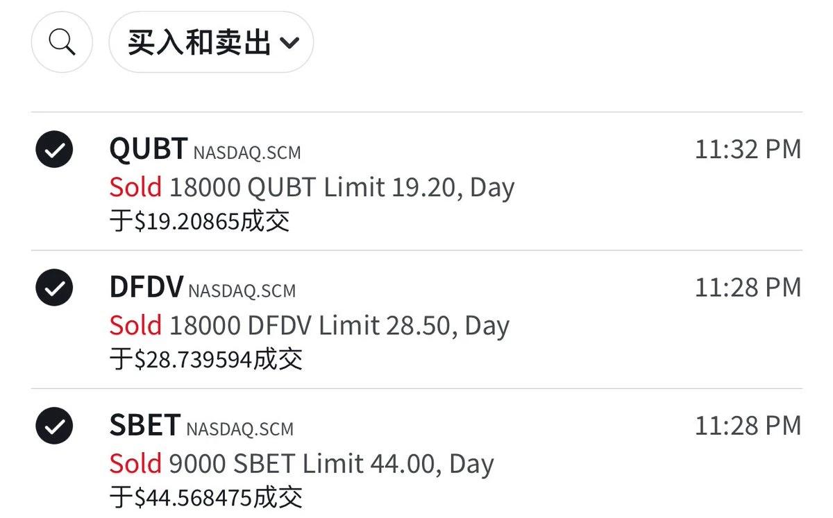 6 月 11 日晚上 10 时左右,随着 Sharplink 完成 4.25 亿美元融资并逐步买入 ETH,SBET 股价逐渐企稳,川沐也不再犹豫,于当天买入 10000 股 SBET,买入均价为 39.5 美元左右。值得一提的是,其还以 27.3 美元的均价买入了 20000 股 dfdv, 以 19.1 美元均价买入了 20000 股 qubt;此外,其还以 113 美元均价卖出了 15000 股 CRCL。