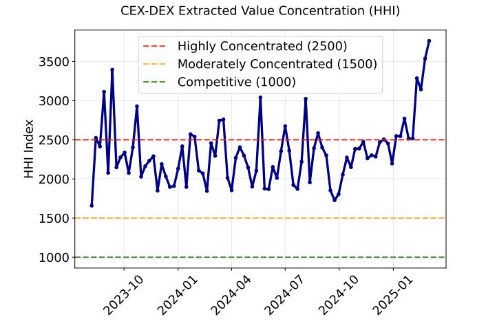 基于套利者的市场份额分析,我们确认 CEX-DEX 的 MEV 市场集中化趋势已达到“高度垄断”级别。