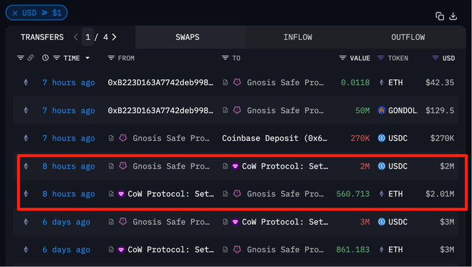 WLFI 关联地址再次花费 200 万枚 $USDC 买入 560.713 $ETH ,均价 $3,566.88 过去六天已累计买入 10,574.25 ETH(约 3798 万美元),均价 $3,591.61,目前浮盈 51.1 万美元 钱包地址 intel.arkm.com/explorer/addres...… 本文由 #Gate 大门交易所 | @Gateio_zh 赞助