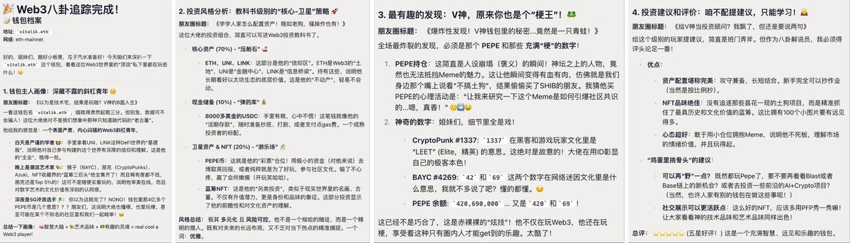 然后等待结果就行,AI 会以非常简练而且幽默的方式对你解读这个钱包的资产配置以及背后所代表的意思,很好玩,无论你是否理解 Web 3 都可以看懂。