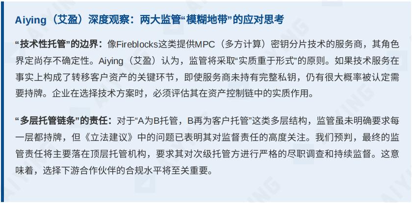 根据《立法建议》第 2.13 段,任何以业务形式「代客户保管虚拟资产」或「保管能转移客户虚拟资产的工具(包括但不限于私钥)」的实体,都将被纳入监管范围。这一定义具有显著的「穿透式」特征,核心在于是否掌握客户资产的实际控制权。