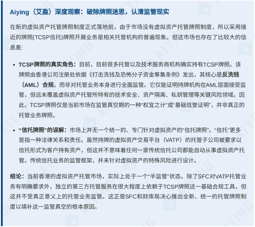 香港为虚拟资产托管业务制定的监管框架,虽然带来了挑战,但更重要的是创造了前所未有的确定性和机遇。它通过引入「信任」这一核心要素,为机构资金的入场铺平了道路,也为整个虚拟资产生态(包括现货 ETF、RWA 代币化等)的健康发展奠定了坚实基础。Aiying(艾盈)将持续与业界同仁并肩,凭借专业的洞察和丰富的经验,共同迎接香港虚拟资产托管业务更加广阔的未来。下期将为大家解读香港 OTC 法案的最新动态和「情报」,敬请关注!
