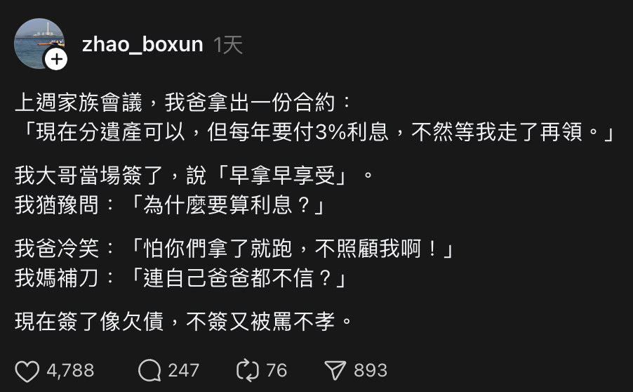 台湾人疯 Threads,上面的贴文也千奇百怪,最近这串的内容就很 Drama:原作者的爸爸在家族会议上宣布,子女可以「提前继承」遗产,但条件是每年要付 3% 的利息给他,直到他过世为止。大哥二话不说签了,觉得「早拿早享受」,但发文者却陷入两难,表示自己签了像是欠债,不签又被贴上「不孝」的标签。