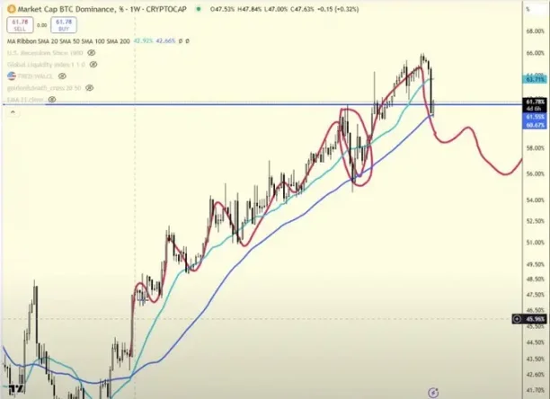 比特币主导地位已连续四周下跌,但如今正从关键支撑位(50 周移动平均线)反弹。