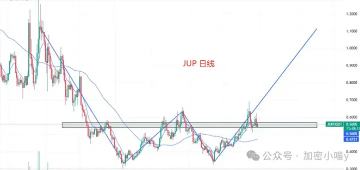 📌 #JUP:标准双底形态,站稳颈线,阻力转枝撑,结构很干净,只要不跌回区间,看1.10。